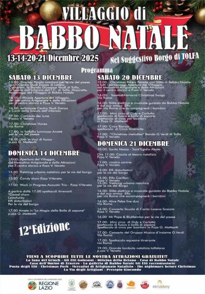 IL VILLAGGIO DI BABBO NATALE a Tolfa (RM), propone uno dei mercatini di artigianato natalizio più belli del litorale laziale con 28 installazioni presenti in Piazza Vittorio Veneto e lungo via Roma. Non potrà mancare l'eccellenza del paese: LA CATANA (conosciuta anche come la Tolfetana), la borsa autoctona in cuoio per cui Tolfa è famosa in tutto il mondo.